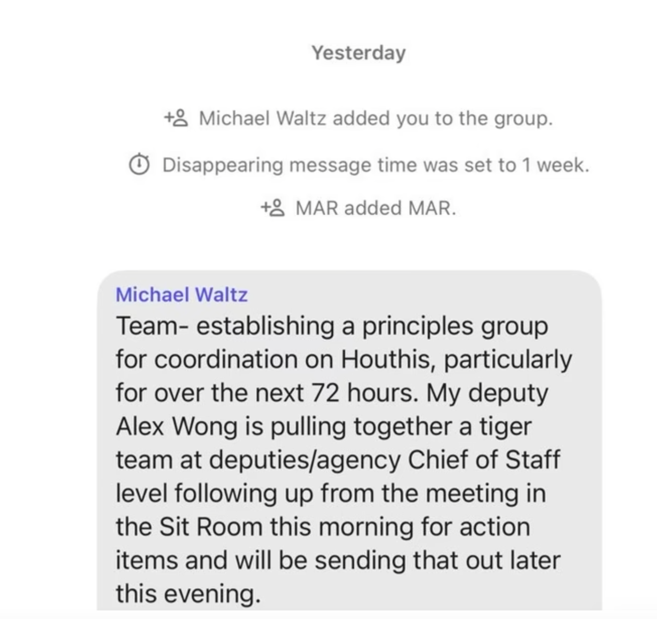 The messages begin: “Michael Waltz added you to the group” and appear to show discussions of specific airstrike plans—undermining the administration’s assertion that the information wasn’t classified.
