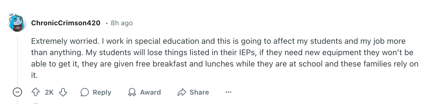 “Extremely Worried...My students will lose things listed in their IEPs. If they need new equipment, they won’t be able to get it,” wrote a special-ed teacher. “They are given free breakfast and lunches while they are at school and these families rely on it.”